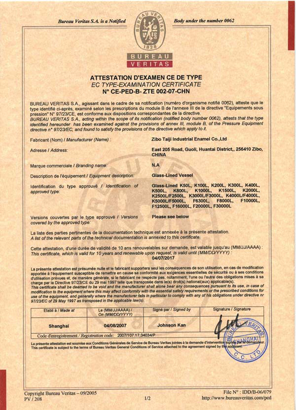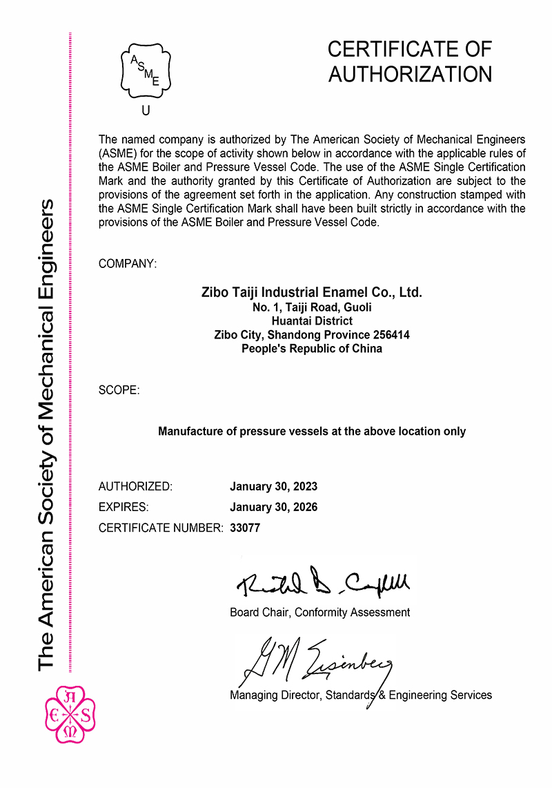 淄博太極在中國(guó)搪玻璃設(shè)備制造行業(yè)中首家通過(guò)ISO90001質(zhì)量體系認(rèn)證,并擁有美國(guó)ASME認(rèn)證、歐洲PED認(rèn)證以及國(guó)家部門(mén)頒發(fā)的搪玻璃制造許可證、進(jìn)出口許可證和百余項(xiàng)榮譽(yù)證以及三十六項(xiàng)專(zhuān)利等。